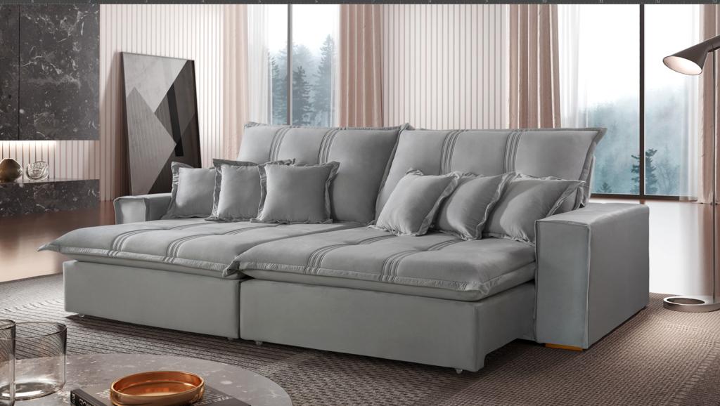 Sofá Ferrara madeira reflorestada, seca e imunizada, produto com assento retrátil com mola POCKET, mola BONEL e espuma D28,revestida com manta siliconada, Pillow 20 CM, percintas elásticas, divisão funcional capaz de proporcionar ao cliente uma acomodação perfeita, pés de madeira, encosto de encaixe com catracas reclinável em 5 estágios e almofadas preenchidas com 100% de fibra siliconada.